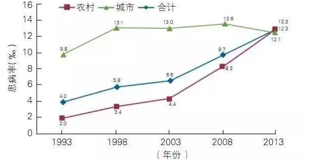 2017年6月,《中國心血管病報告2016》發(fā)布,報告概要刊登于中國循環(huán)雜志。國家衛(wèi)生服務調查結果顯示,1993~2013年期間,我國腦血管病患病率整體呈上升趨勢,以前是城市高于農(nóng)村,但目前已經(jīng)發(fā)生逆轉。2013年的第五次調查顯示,城市腦血管病患病率(12.1‰)有所下降,農(nóng)村(12.3‰)仍呈明顯的上升。腦卒中現(xiàn)患人數(shù)約1300萬,腦卒中給中國造成的經(jīng)濟負擔每年高達400億元。