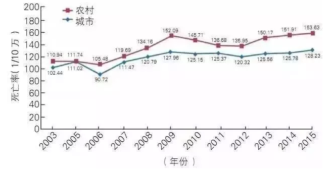依據(jù)第六次人口普查數(shù)據(jù),2015年死于腦血管病的城鎮(zhèn)居民為85.36萬人,農(nóng)村居民103.49萬人?傮w上看農(nóng)村地區(qū)腦血管病死亡率高于城市地區(qū)。進一步分析表明,我國腦卒中死亡率下降的主要因素可能有以下幾種:1、中國整體醫(yī)療保障的改善;2、臨床診斷和救治技術的進步;3、城市居民腦卒中發(fā)病率下降;4、卒中防治知識水平的普遍提高。經(jīng)濟狀況與健康知識會影響患病率與死亡率:卒中患病率和不同教育水平呈負相關關系,即小學和以下文化卒中患病率最高,大專及以上最低。