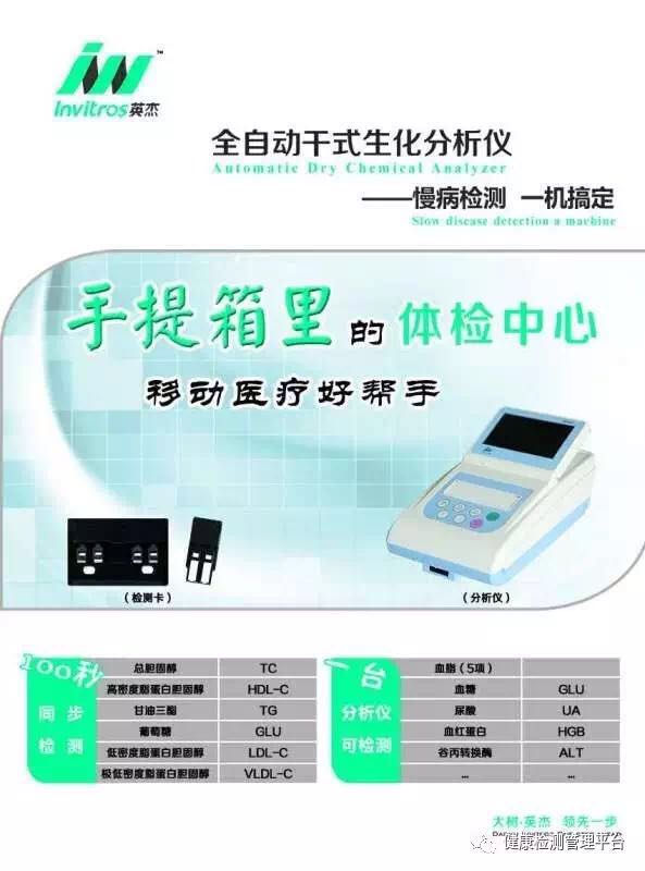 南京大樹英杰——全自動干式生化分析儀,100秒同步檢測總膽固醇、高密度脂蛋白膽固醇、甘油三酯、葡萄糖、低密度脂蛋白膽固醇、極低密度脂蛋白膽固醇,尿酸,血紅蛋白和谷丙轉(zhuǎn)氨酶。手提箱里的體檢中心,移動醫(yī)療好幫手。。